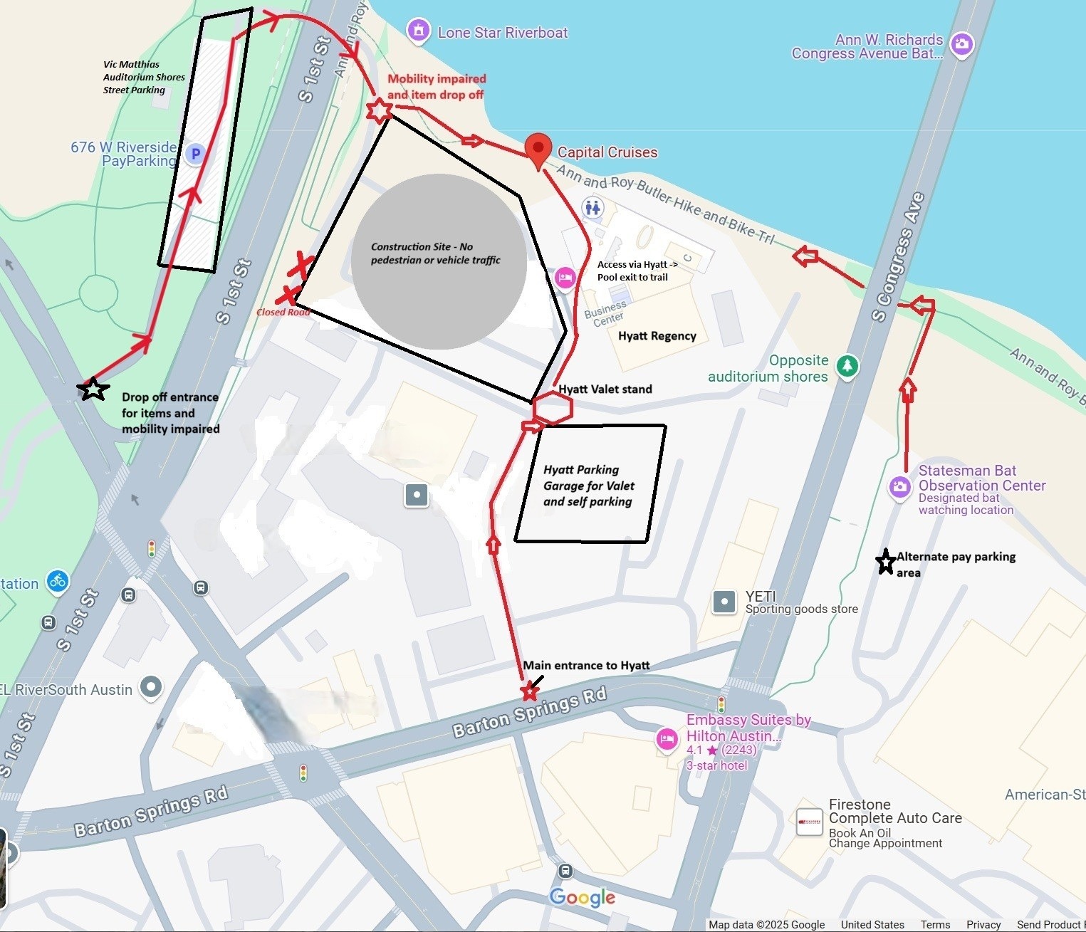The Hyatt Regency Hotel is the easiest and closest place to find parking. Parking in the garage is a short walk to our dock lakeside of the hotel and hotel staff can easily direct you to the dock. NOTE: DUE TO CONSTRUCTION BOTH AT THE HYATT AND THE LOT IN FRONT OF THE HOTEL, ACCESS TO OUR DOCK FROM THE HIKE AND BIKE TRAIL IS EITHER THROUGH THE HOTEL OR AROUND THE CONSTRUCTION AREA NEAR AUDITORIUM SHORES (PLEASE SEE PICTURES BELOW FOR DROP OFF INFORMATION). PASSENGERS WITH MOBILITY ISSUES SHOULD BE DROPPED OFF AT THE TRAIL HEAD NEXT TO LONESTAR RIVERBOAT BEFORE PARKING. Passenger drop off can be done at the front door of the hotel if needed, but the walk from there is either through the hotel or around the construction area. Self parking rates are ~$28 for up to 3 hours of parking at the hotel but you can obtain a voucher from our dock for discounted self parking (~$20). This rate is subject to additional charges for longer stays and can vary during holidays and special events. In addition, there are multiple pay parking spots in the area. All parking areas are run independent of Capital Cruises and rates vary greatly depending on location. Busier weekends and special events may increase parking rates. Other possible pay parking lots include street parking on Barton Springs, Palmer Events Center, the Statesman Lot just east of Congress Avenue, or less than 2 hour parking at Vic Matias Shores (Auditorium Shores). Click on parking map image below to enlarge.